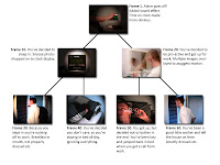 To display how my story works I created a flow diagram of how events occur. It's modeled on the original diagram I drew when I had the idea. You can see how my idea progressed from a simple concept on paper, to the final piece.When its displayed in this way it makes the whole process seem so simple. I really struggled to find a narrative which could fit to this framework, mainly because I've never attempted anything like this before. The resulting piece of work however I'm quite pleased with. I don't feel it's as successful as the last two projects, mainly because I don't like the media here as much. It's difficult to display the depth of your story through still images and sound alone. Giving the user control also makes things more difficult because you can't guarantee that everyone will have the same experience. I know that in all medias people draw from things what they want, but with this media in particular there are more ways the user can be influenced.